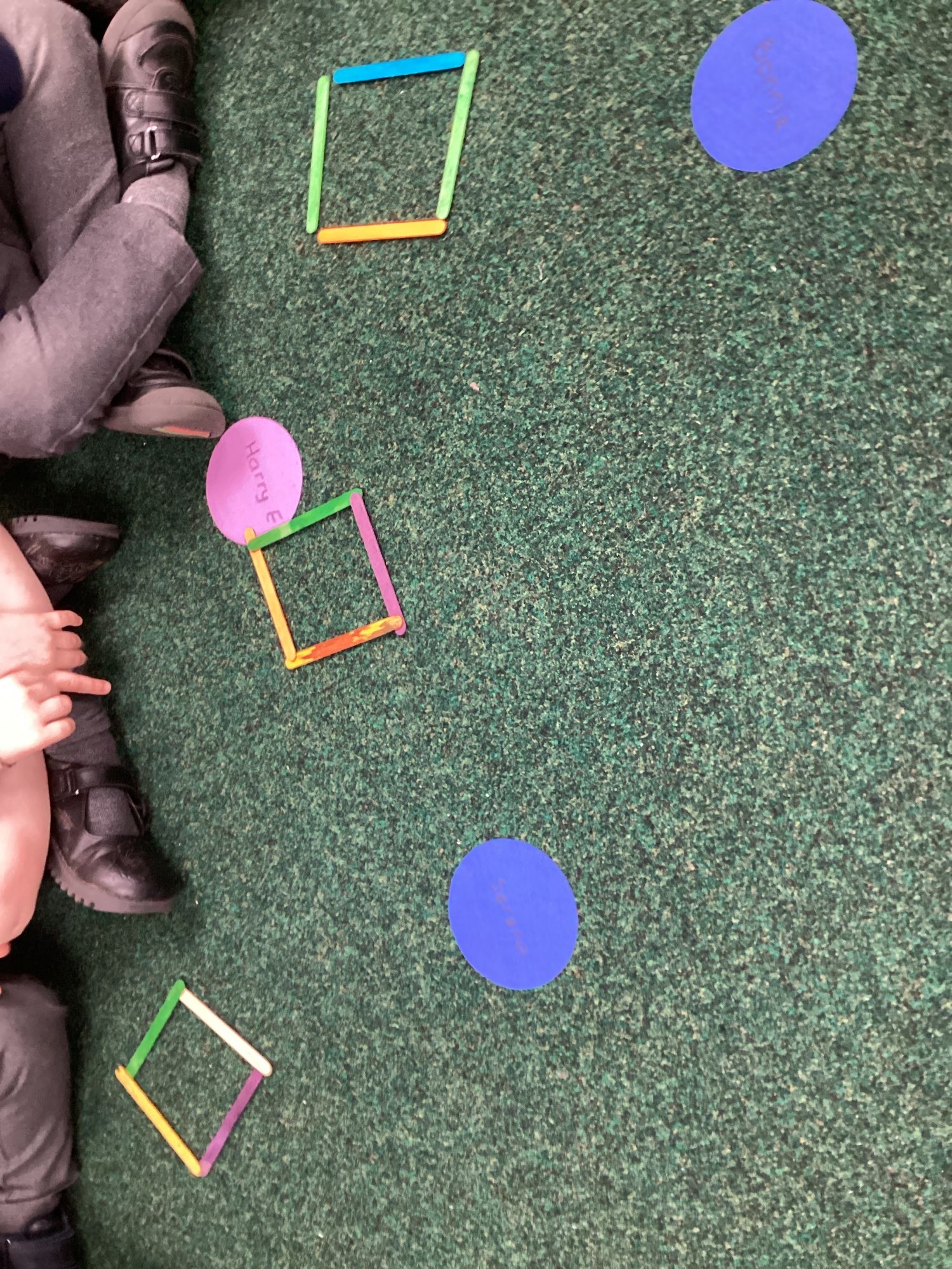 In P.E. the Witch was chasing Rapunzel under the parachute and in maths we explored the number 4. We found out that squares have 4 sides and 4 corners and we made squares with lollipop sticks.