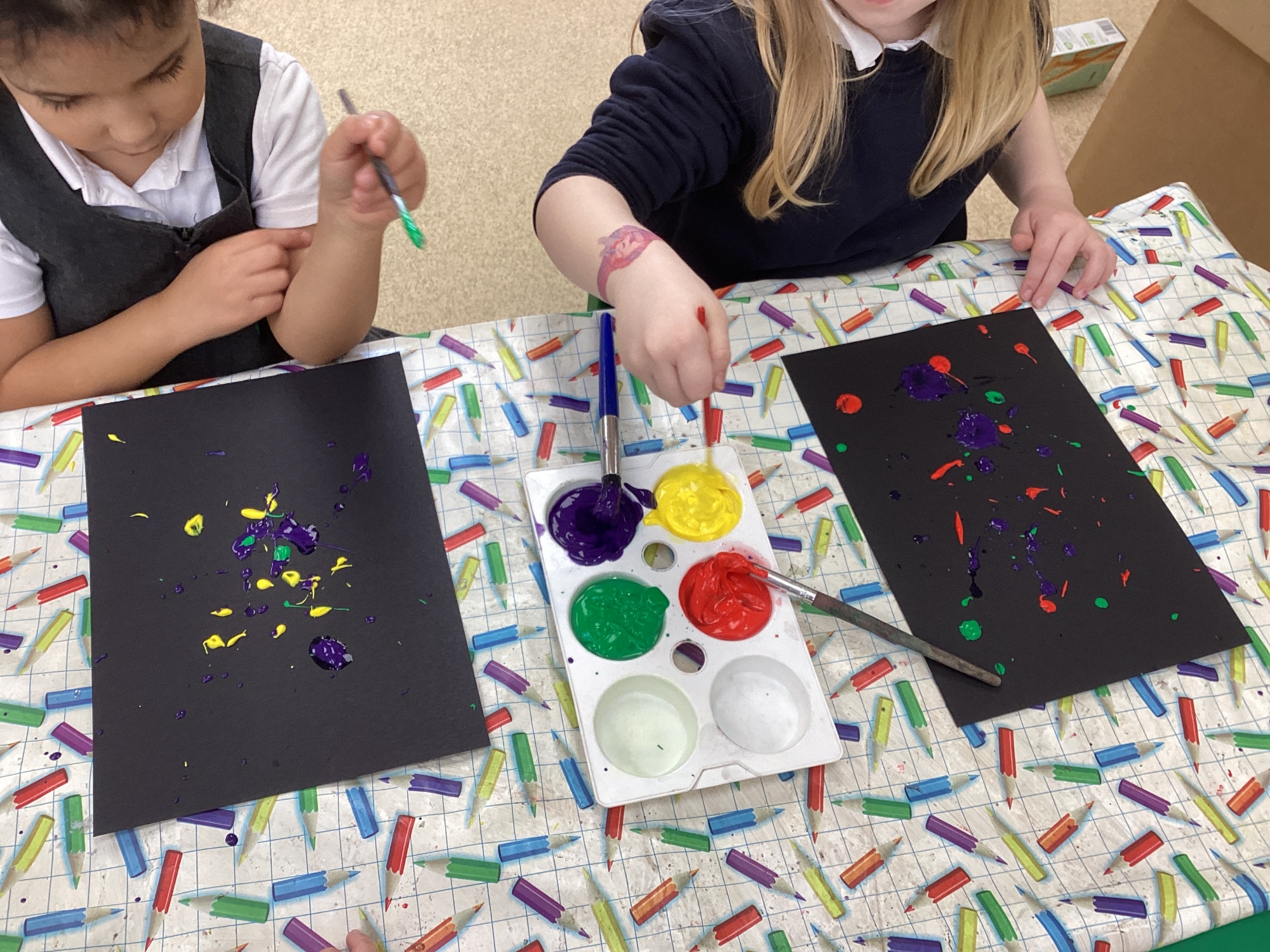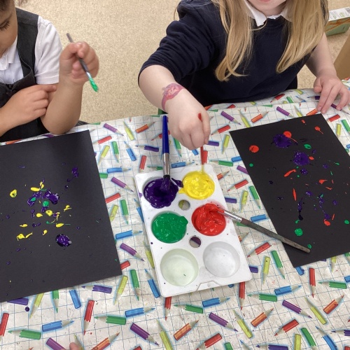 We’ve had such a fun and busy week in class. The children loved writing their postcards from the Martian to the boy. In Drawing Club, their ideas really took off as they sketched exciting ideas for new tools that the boy could use to help fix the Martian's spaceship. Our creative work continued in Expressive Arts, where the children made fantastic moving astronauts using split pins and designed colourful space backgrounds to go with them. In Understanding the World, we explored how objects fall to the ground when they are dropped, and the children enjoyed linking this idea to splatter painting, watching how the paint fell just like real objects do. They have been busy during play and learn time making astronaut helmets and have fun on the bikes outside. It’s been a week full of imagination, creativity, and discovery.