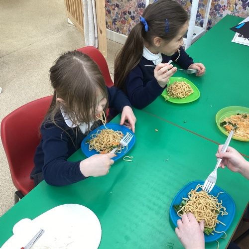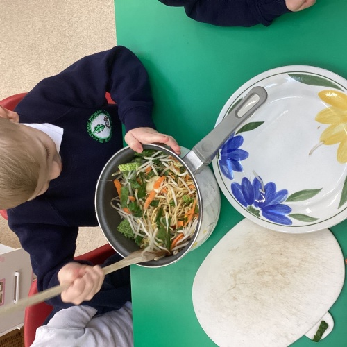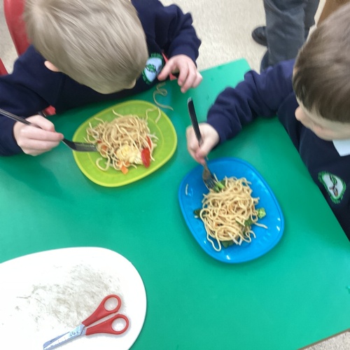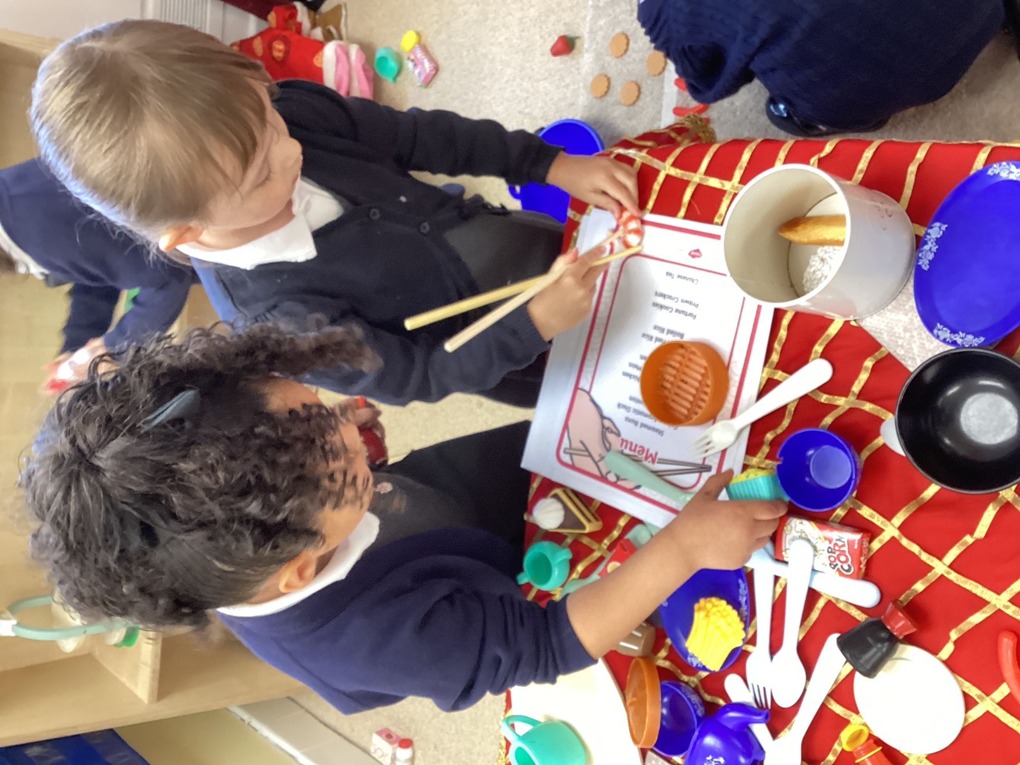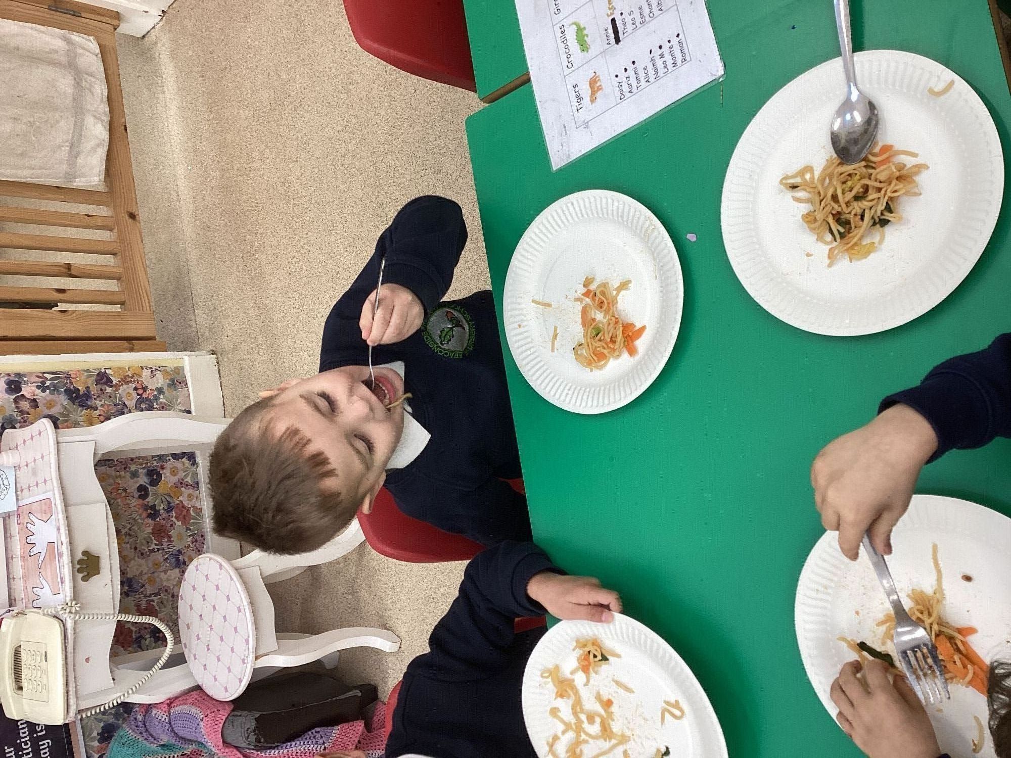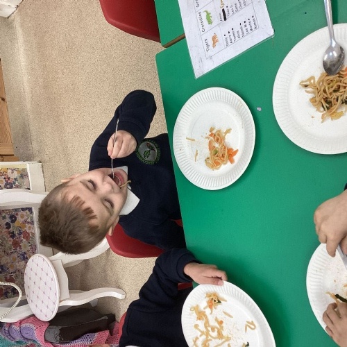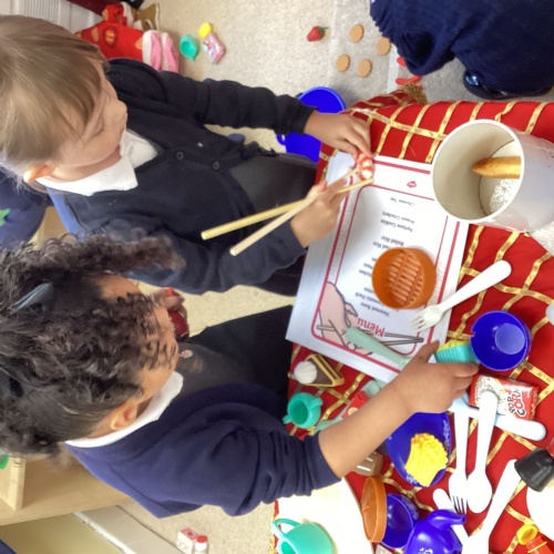 This week we have been learning all about Chinese New Year through a wide range of exciting activities. The children listened to The Great Race and enjoyed sharing their favourite parts with a partner before retelling the story using props and role‑play. They explored new vocabulary linked to celebrations and compared how people in England and China celebrate special occasions. One of the highlights of the week was tasting traditional Chinese foods such as noodles, prawn crackers and fortune cookies. The children predicted what each food might taste like, tried them, and talked about which they preferred. We also looked at pictures of other Chinese dishes and discussed how they are eaten during celebrations. The children learned to say “Happy New Year” in Chinese and used this in their play, especially in our Chinese restaurant role‑play area, complete with bowls, chopsticks, woks and red decorations. They also acted out the story using masks and a pretend river.
