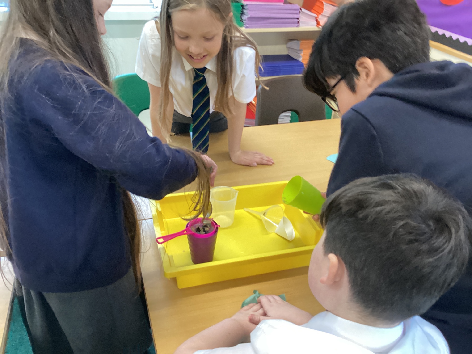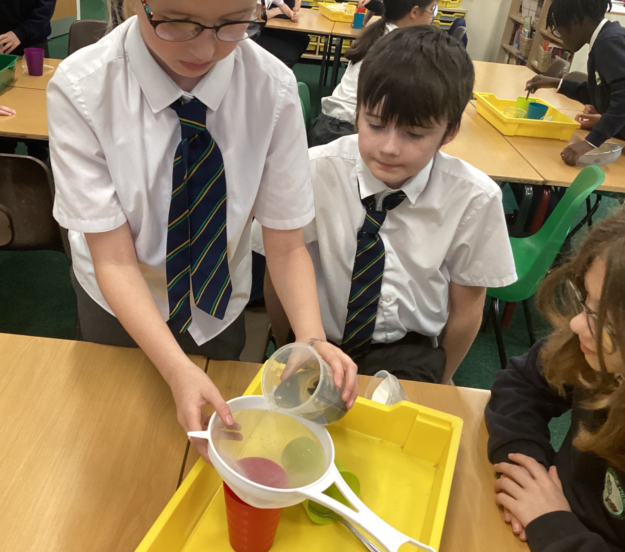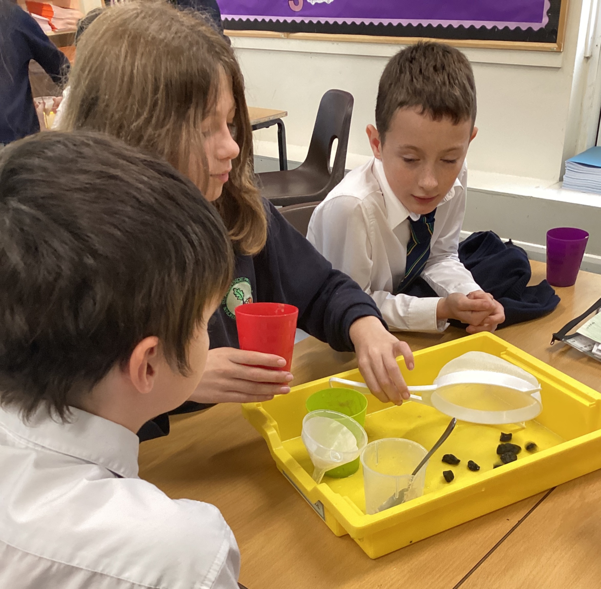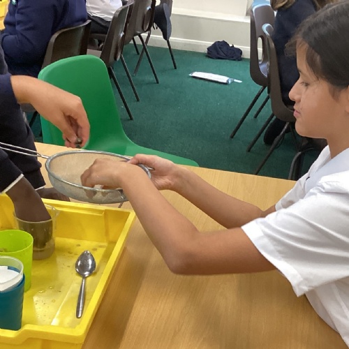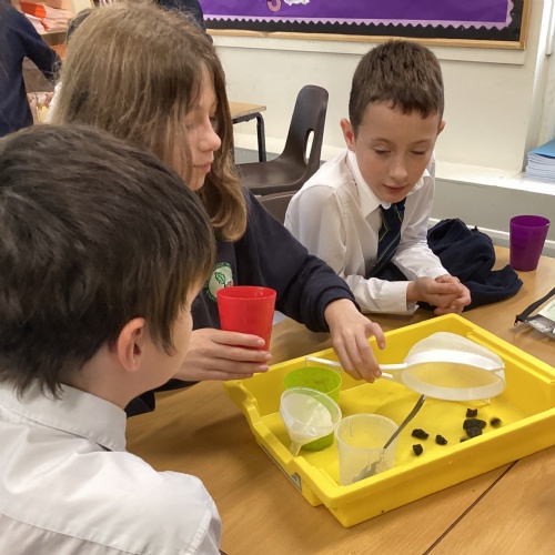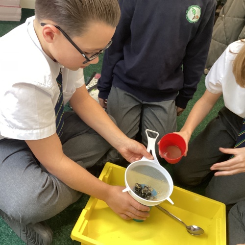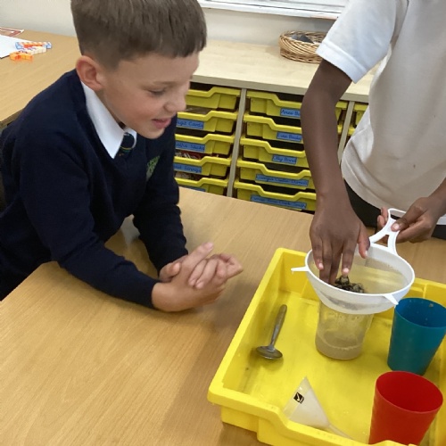 We also experimented with ways to separate pebbles and sand from a solution of salt and water.