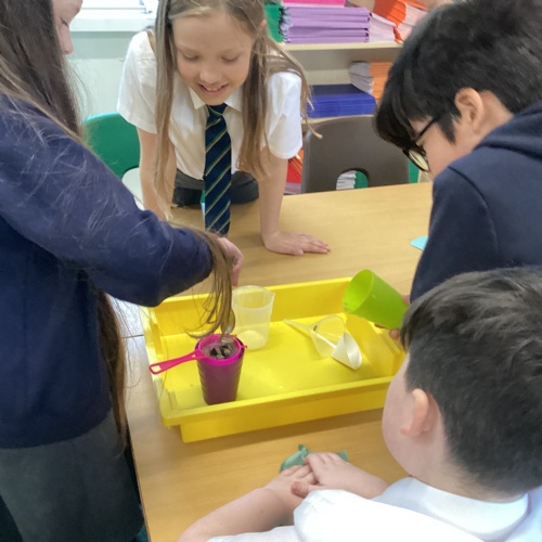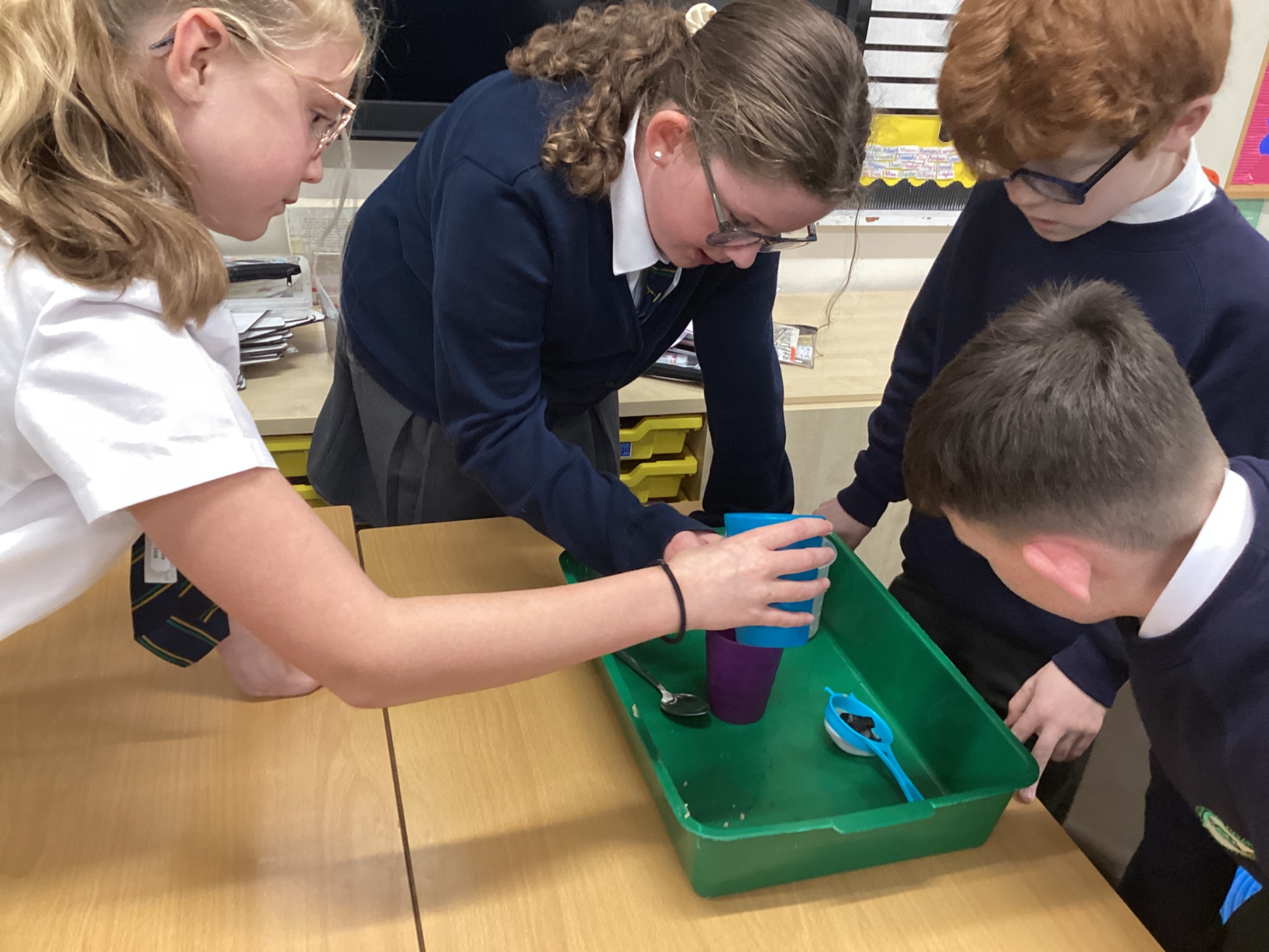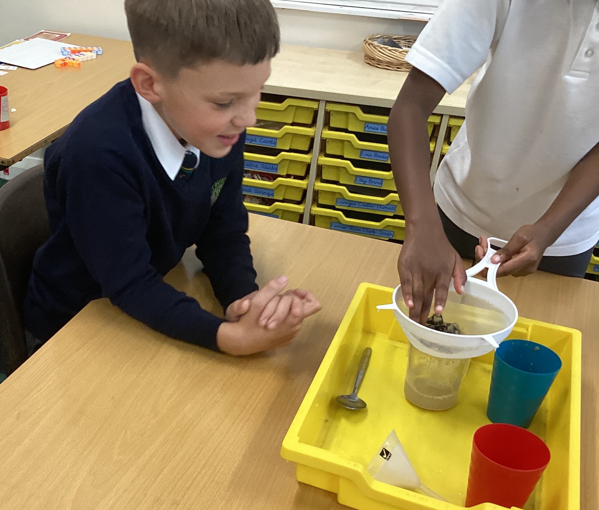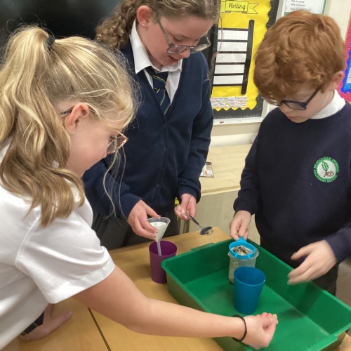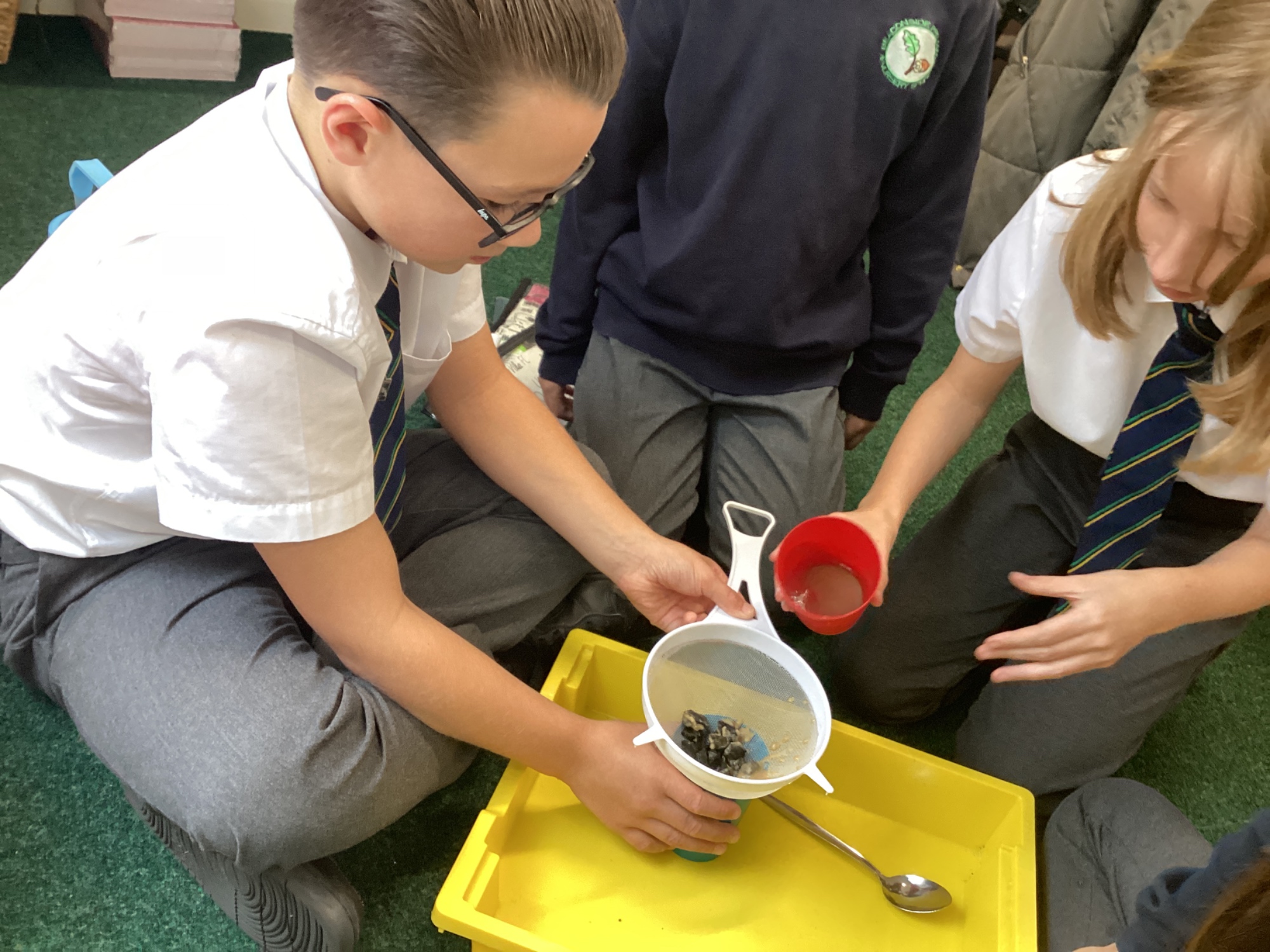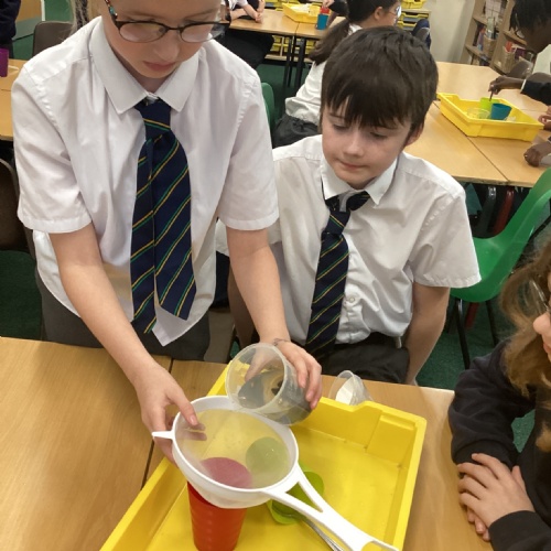 We also experimented with ways to separate pebbles and sand from a solution of salt and water.