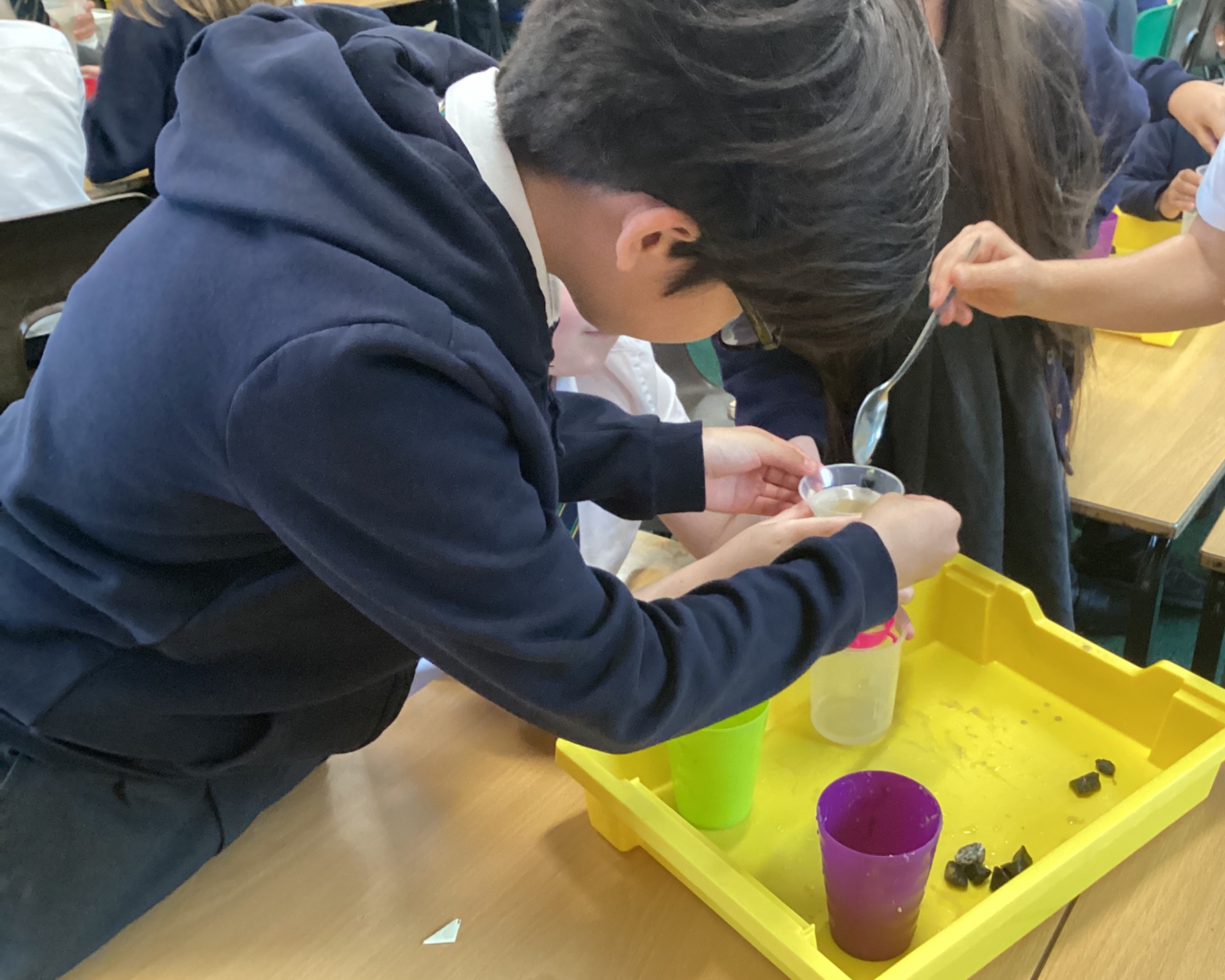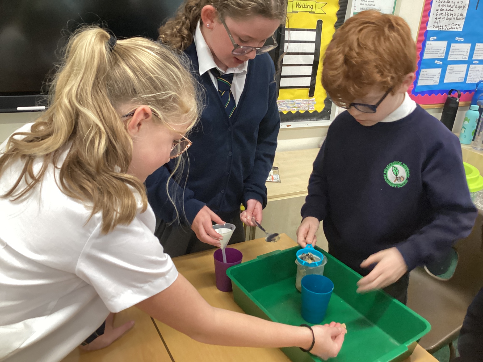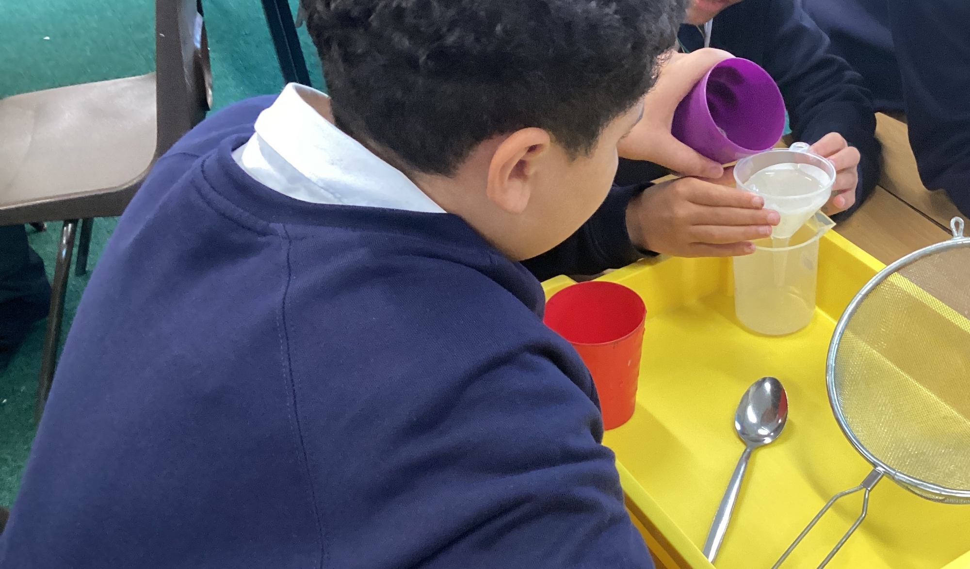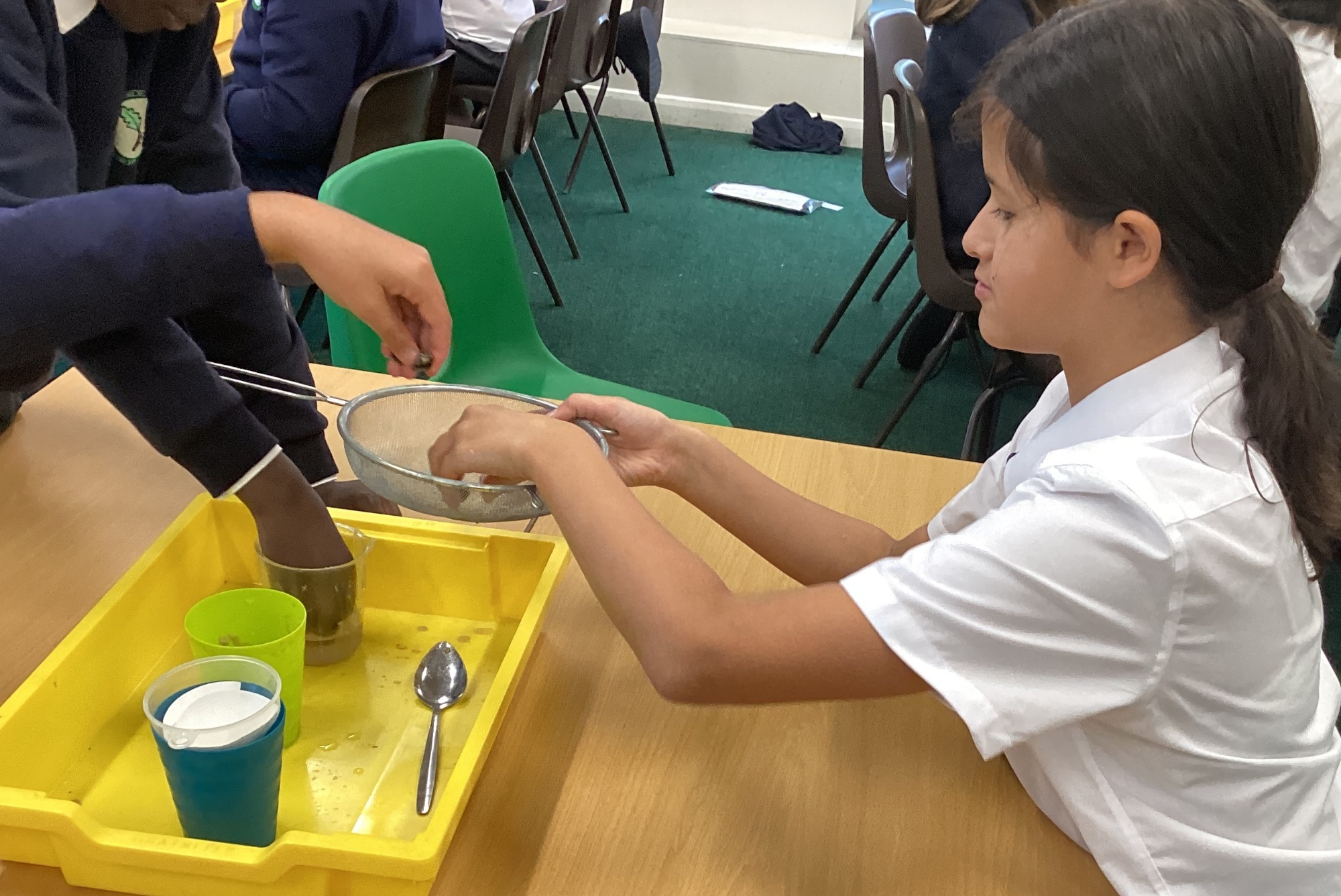 We also experimented with ways to separate pebbles and sand from a solution of salt and water.