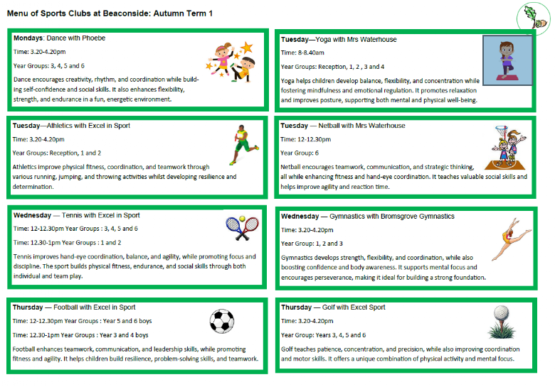 Football club will continue to run at Beaconside delivered by a local company – Premier Progress. Whilst this club is only available to Beaconside pupils, it is a private letting to an external company and not facilitated/supervised by school staff. However, to guarantee the safety of our pupils, we have ensured that the company has the appropriate safeguarding procedures in place.