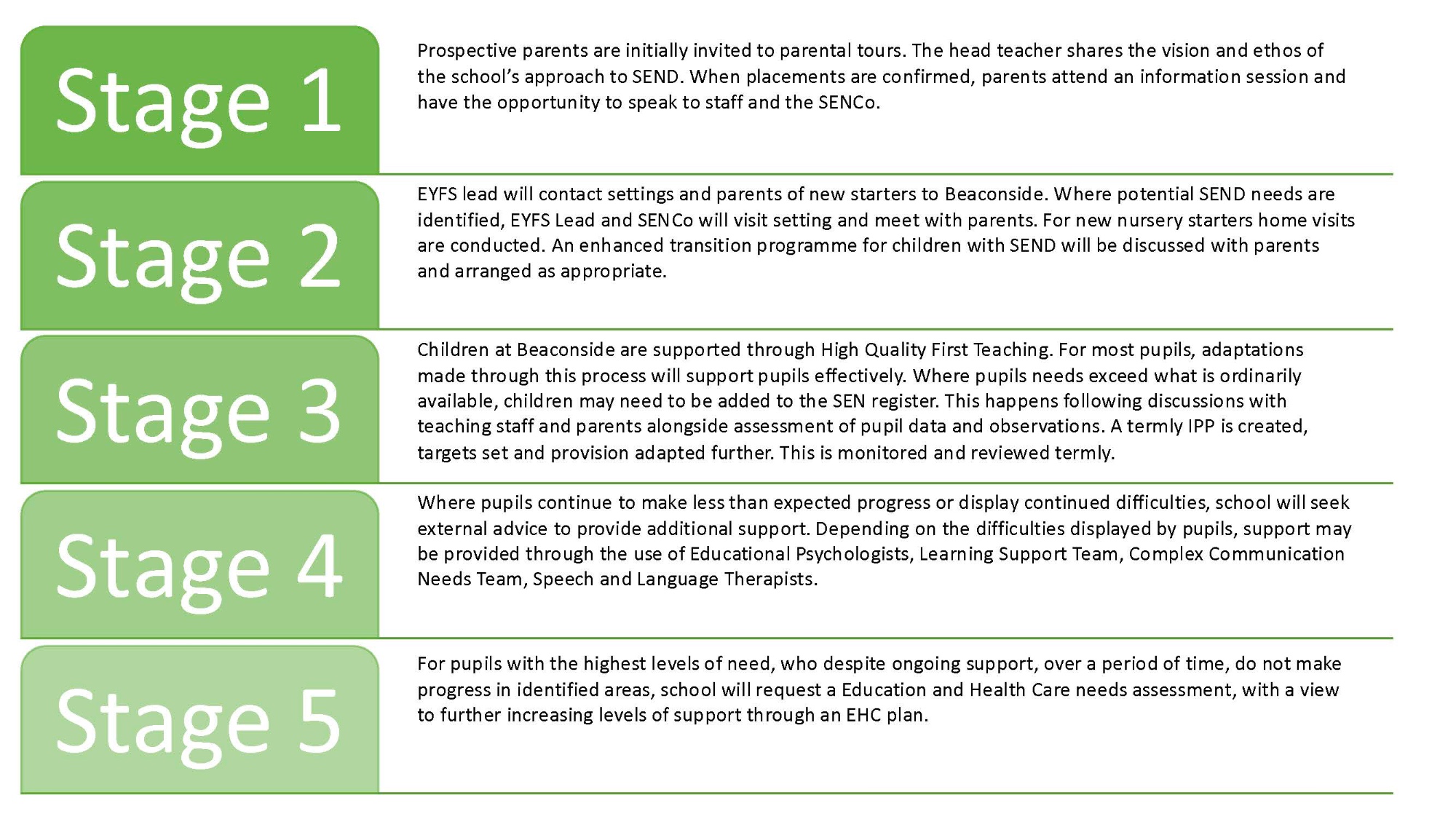 A SEND Information Report details the provision on offer at Beaconside and ensures that the requirements of the above documents are met. The following information can be found in the report: