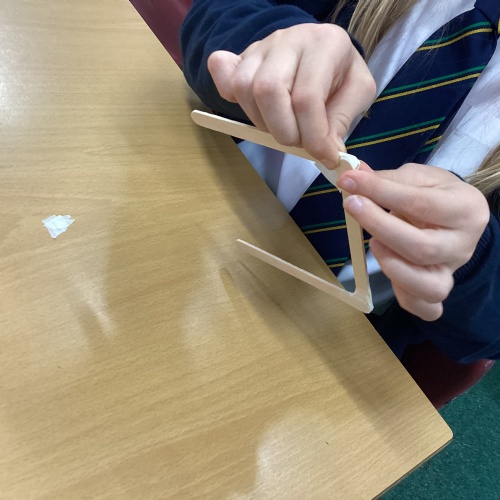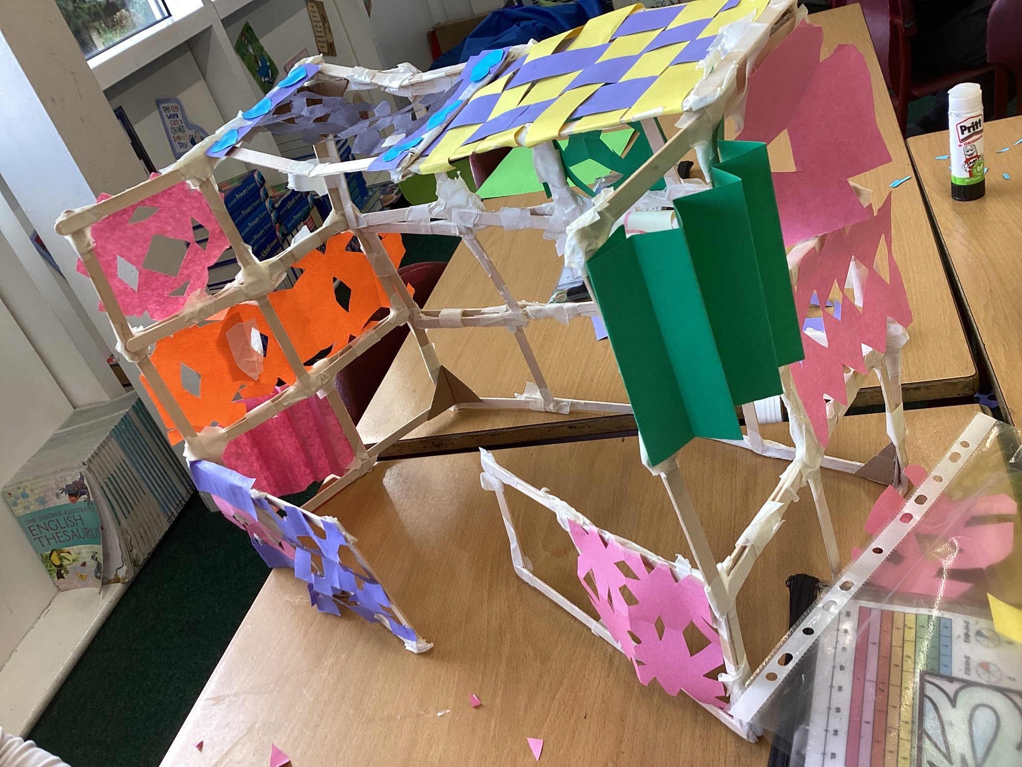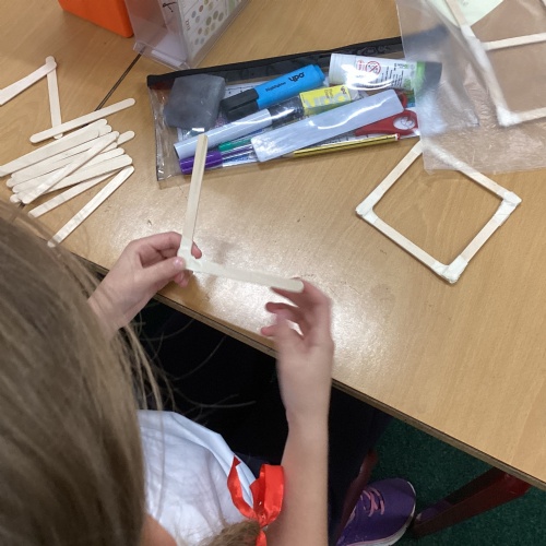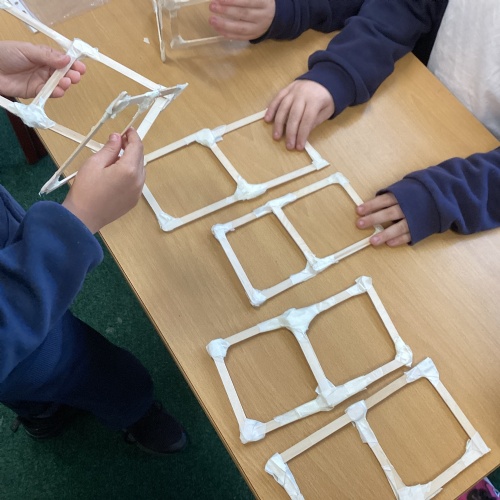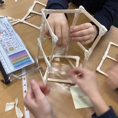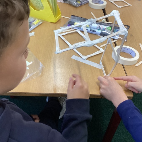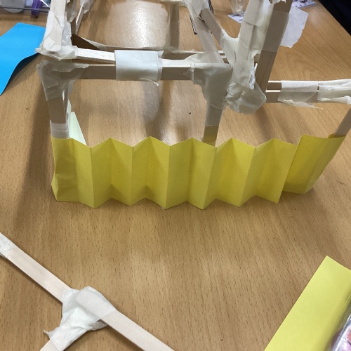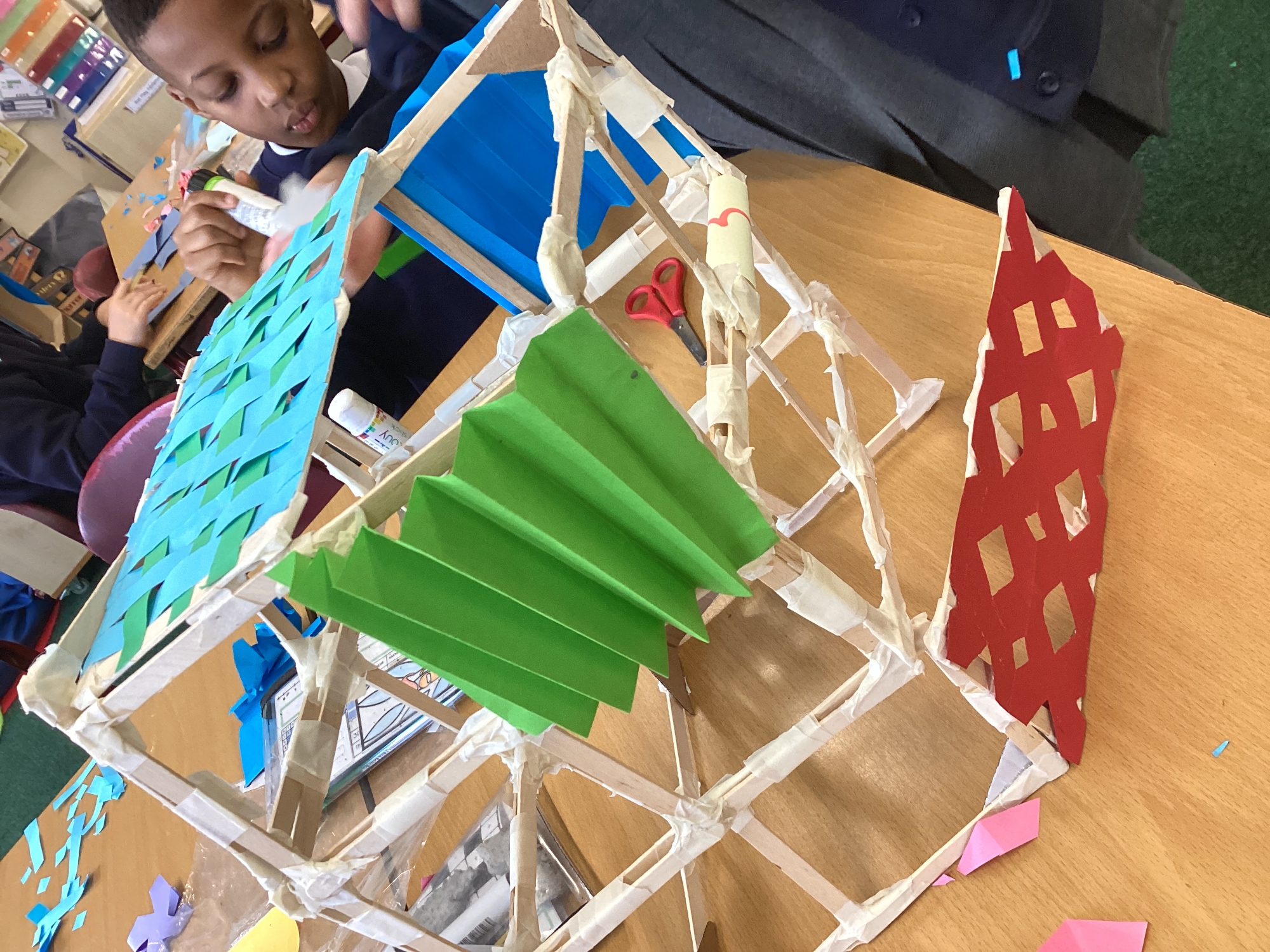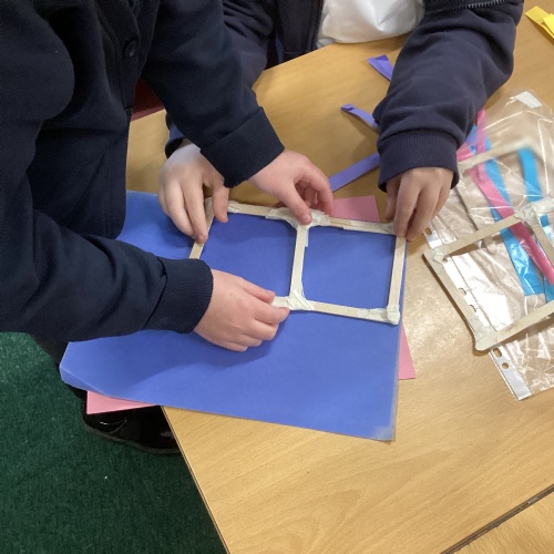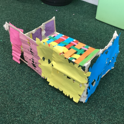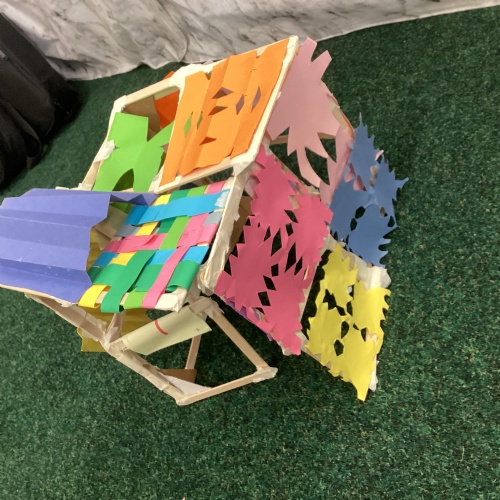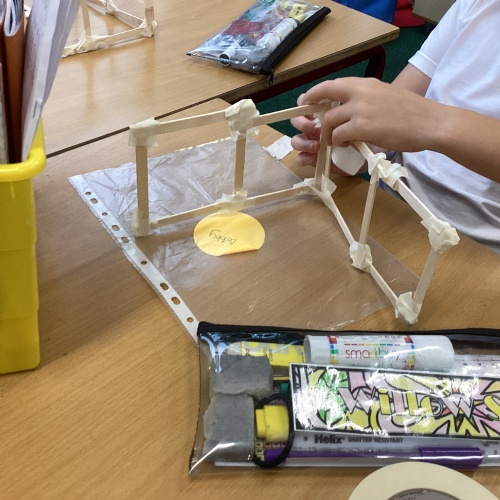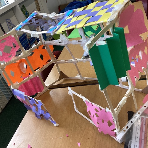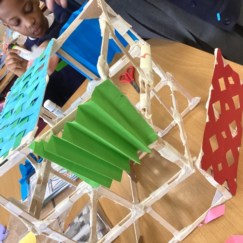 We have been learning how to make a frame structure using different materials. We began by testing out how structures fit together and how we could make them more stable by adding corner pieces. Next we thought about how we could use cladding to make our structures look aesthetically pleasing. We experimented with piercing, folding and weaving to create different patterns and textures.