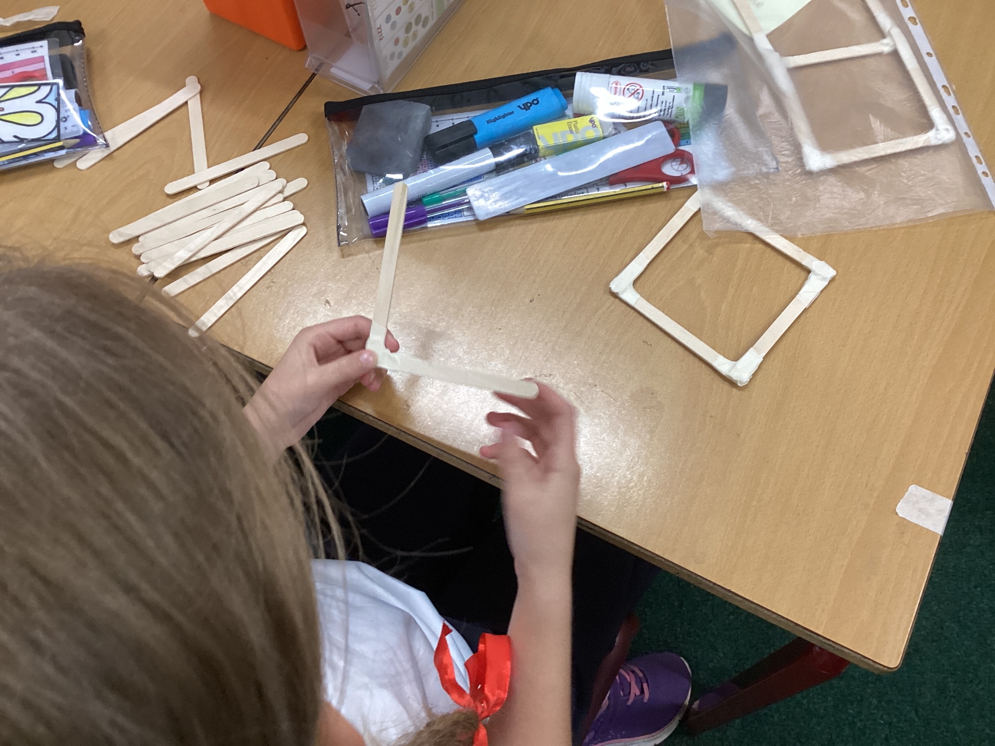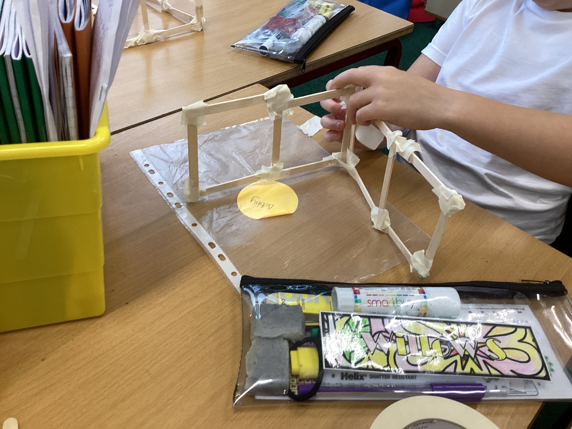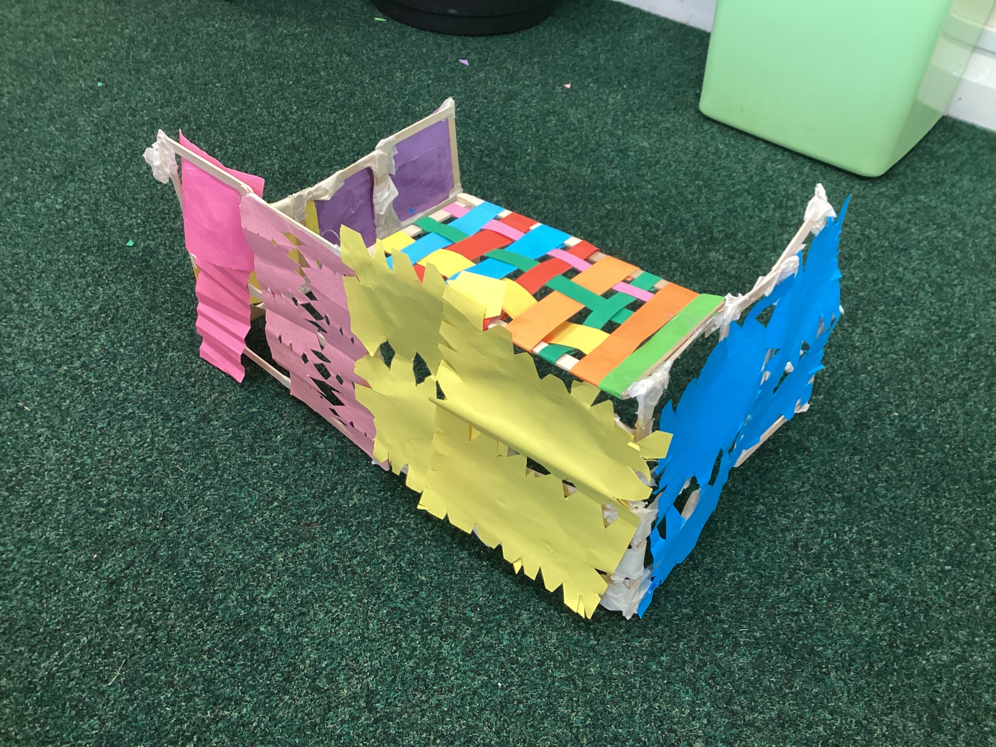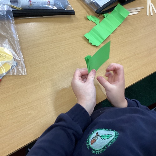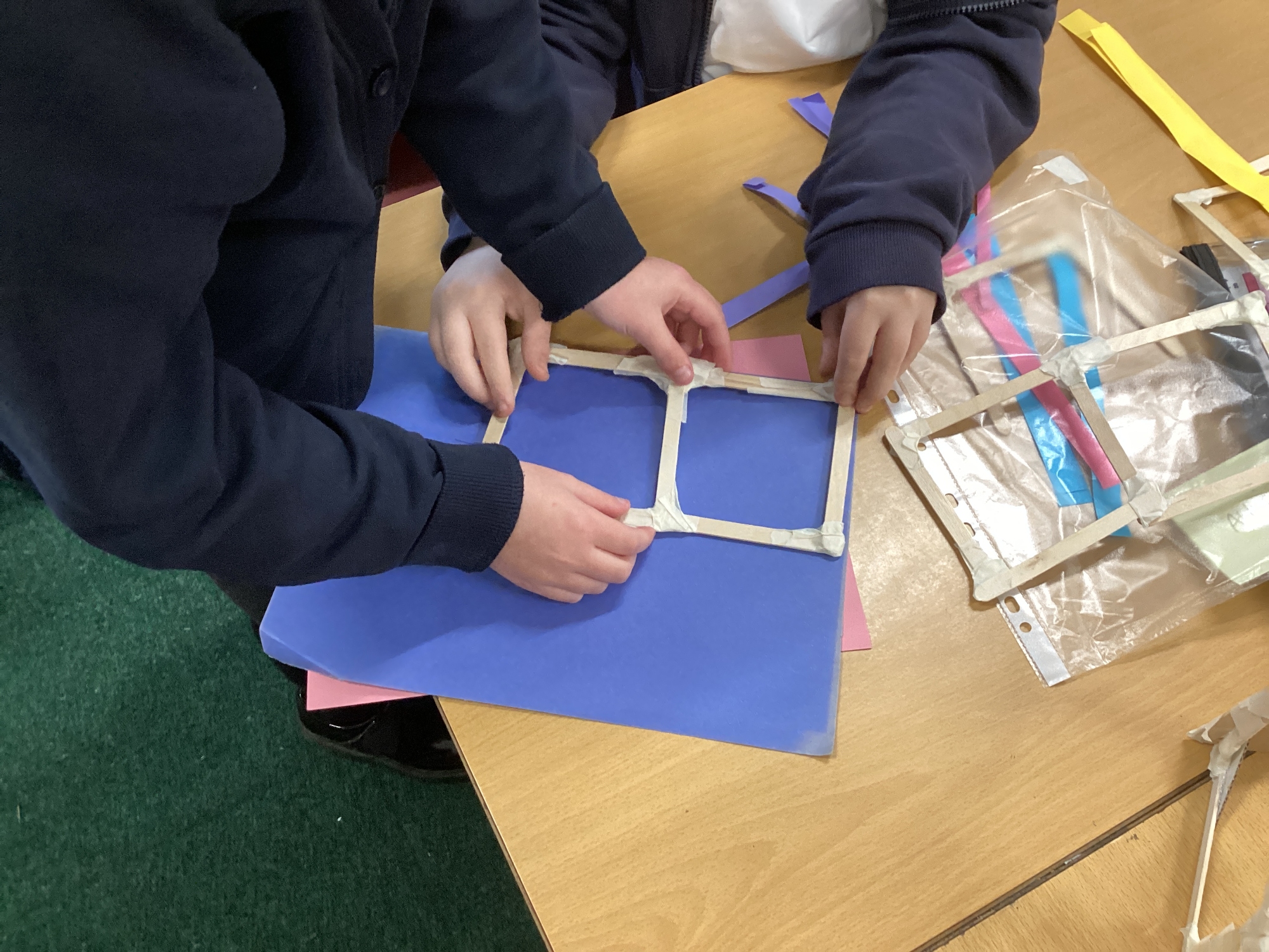 We have been learning how to make a frame structure using different materials. We began by testing out how structures fit together and how we could make them more stable by adding corner pieces. Next we thought about how we could use cladding to make our structures look aesthetically pleasing. We experimented with piercing, folding and weaving to create different patterns and textures.