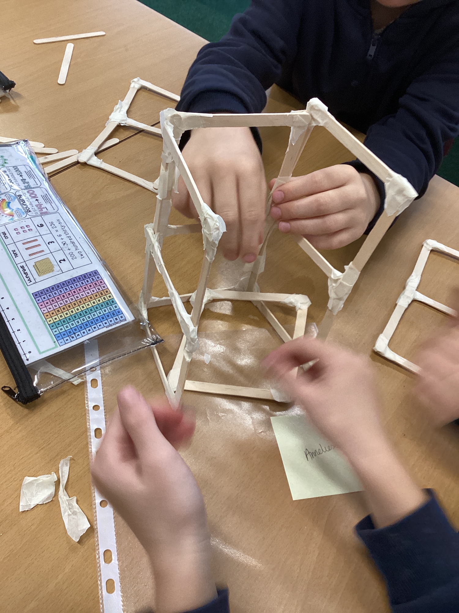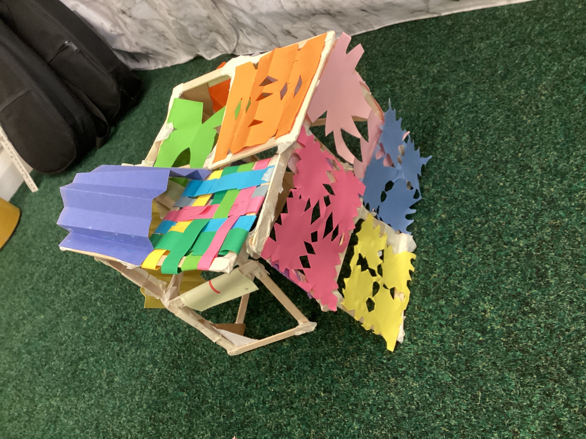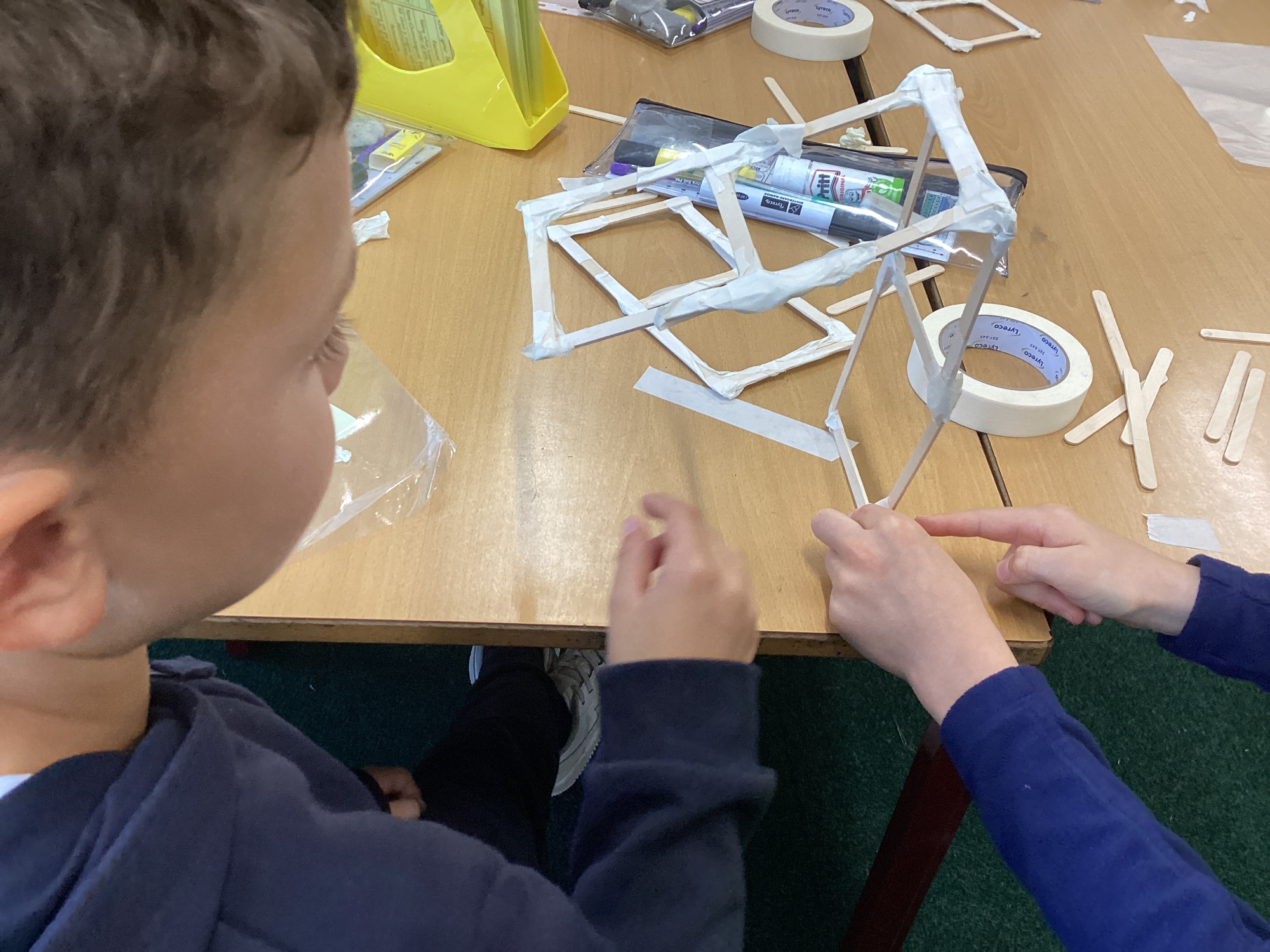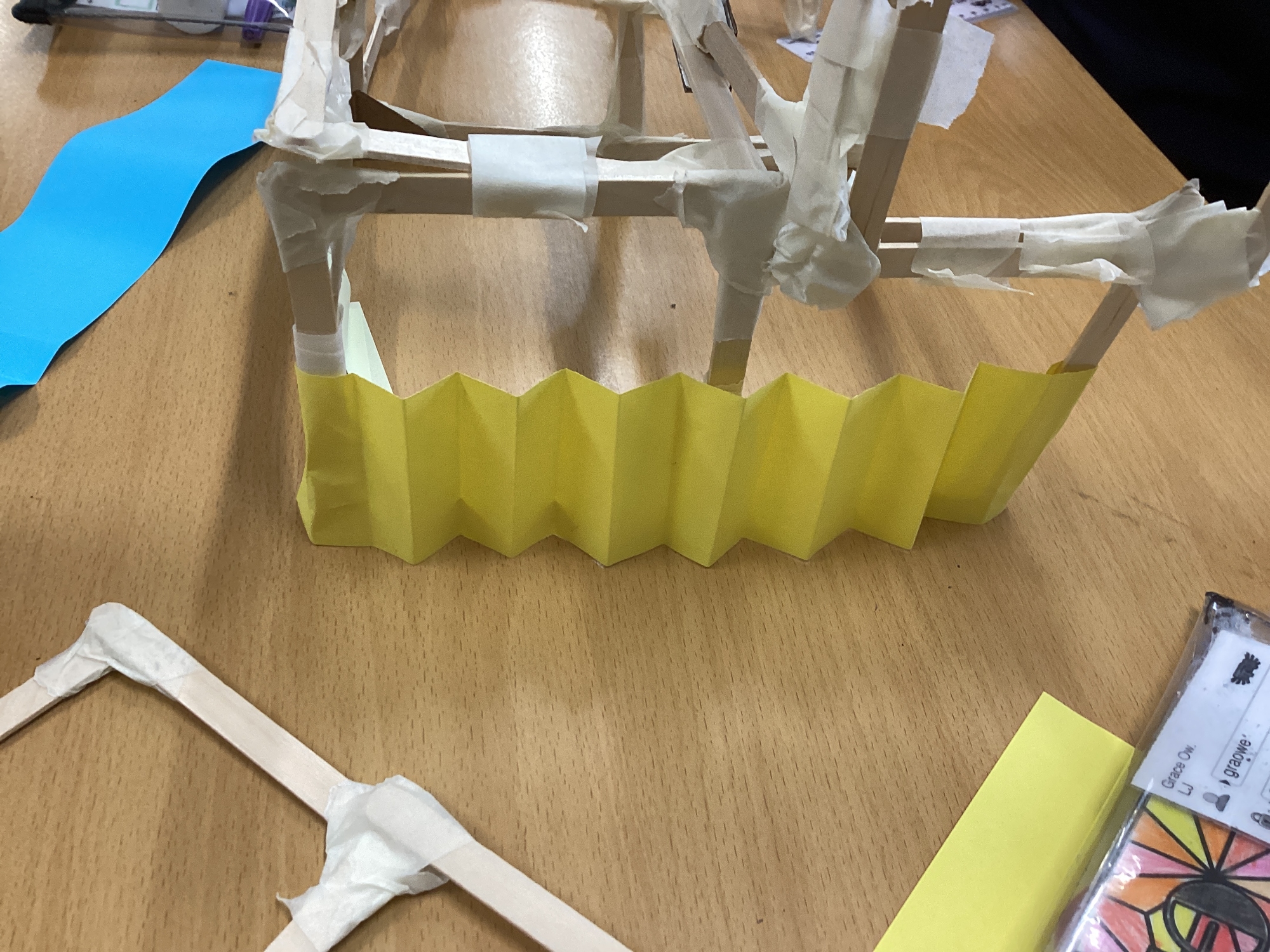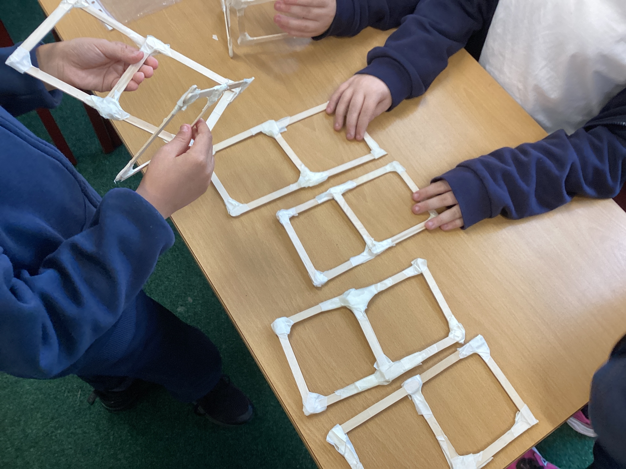 We have been learning how to make a frame structure using different materials. We began by testing out how structures fit together and how we could make them more stable by adding corner pieces. Next we thought about how we could use cladding to make our structures look aesthetically pleasing. We experimented with piercing, folding and weaving to create different patterns and textures.